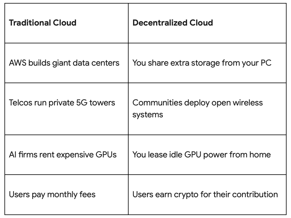 A new model is emerging: the decentralized cloud. Instead of relying on massive data centers, this model runs on people-powered infrastructure where anyone can share spare bandwidth, storage, or compute power from their own devices. And get rewarded for it. This shift is part of a broader movement known as DePIN Decentralized Physical Infrastructure Networks.
