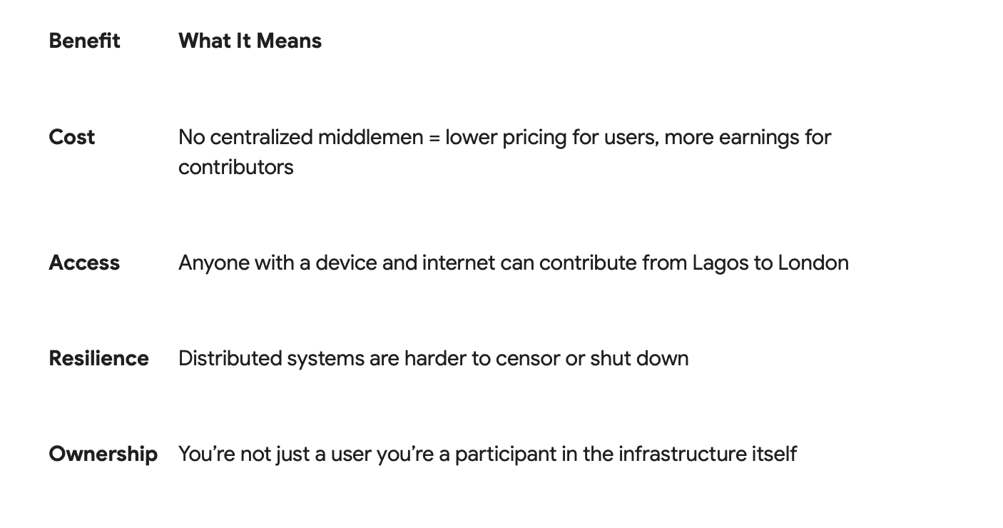 DePIN addresses all of these issues. It reduces costs, increases global access, builds resilience, and gives contributors a real economic role in powering the internet.