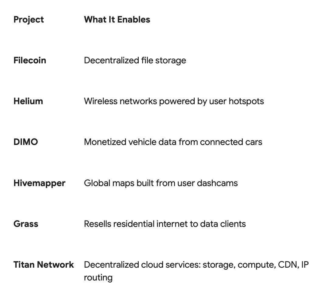 Think of it as Airbnb for the internet's backend: instead of renting out spare rooms, you rent out digital resources and get paid. DePIN is part of the broader Web3 movement, which aims to decentralize not just ownership of assets (like tokens or NFTs), but also the infrastructure that powers the internet and is attached to all of our digital web enabled devices.