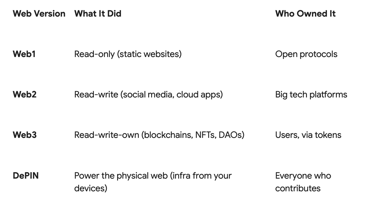 Web3 brought ownership to digital assets. DePIN brings ownership to digital infrastructure.